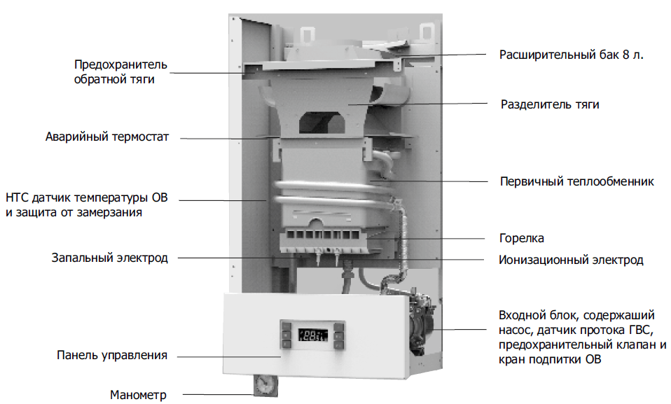 Защита от перегрева теплоносителя, перегрузки, от замерзания, от снижения давления в контуре отопления, от затухания пламени в газовых горелках, от проникновения продуктов сгорания в помещение — система безопасности на высоте.
