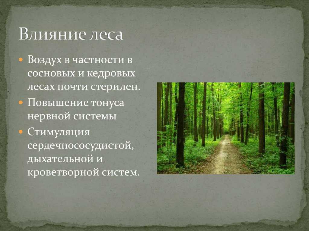 Всем известно, что хвойные леса называются «зеленые легкие планеты» — и не зря. Учеными доказано, что воздух в сосновом лесу является самым чистым — в нем содержится самое маленькое количество бактерий (не более трехсот на кубический метр). Сосны обладают свойством рассеивать особые летучие вещества, которые и обеззараживают воздух.