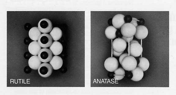 Диоксид титана (TiO2) – наиболее важный белый пигмент, используемый в лакокрасочной промышленности. Он широко используется в составе красок, благодаря эффективному рассеиванию видимого света, придающего белизну, яркость, укрывистость. Диоксид титана существует в двух кристаллических структурах: анатазной и рутильной. Рутильный диоксид примерно на 30% лучше рассеивает свет (укрывистость), чем анатазный, поэтому последний используется гораздо реже. К тому же, анатаз менее атмосферостоек, чем рутил. Анатаз гораздо хуже работает в защите полимера (акрилата, пластмассы) от УФ лучей и приводит к фотокатализу и потере своиств полимера (происходит деструкция, выцветание, меление и т.д.). Таким образом, именно РУТИЛЬНАЯ форма диоксида титана является единственным и безальтернативным белым пигментом в стандартных областях промышленности (краски, пластмассы, бумага) для придания белизны, укрывистости и стабильности системе пигмент+носитель. Сравнение рутильной и анатазной форм: