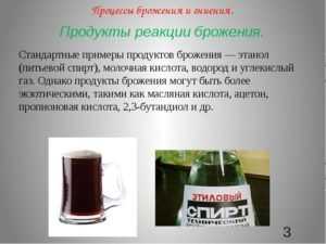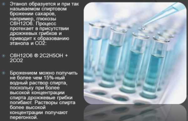 Этиловый спирт получается в результате брожения продуктов, содержащих углеводы, под влиянием дрожжей и бактерий. Содержание этанола в получаемом растворе (бражке) не превышает 15%, при большей концентрации дрожжи гибнут.