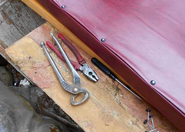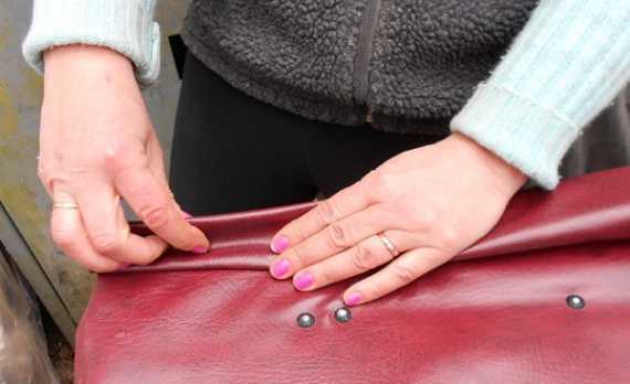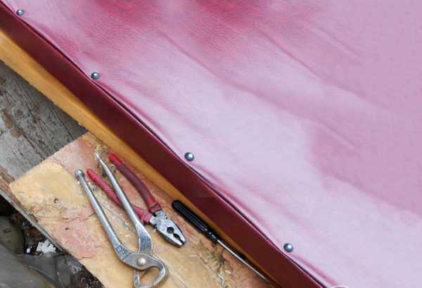 Если на обивке был рисунок, и он вас в принципе устраивает, в места, где были вбиты формирующие рисунок гвозди, вбиваем обычные. Их забиваем не до конца, шляпки должны торчать на 1-1,5 см. С их помощью потом прорвем в нужных местах поролон и обивку (просто надавить пальцами, все слои продавятся). Обычные гвозди вытащим, на их место установим декоративные, при помощи ленты сформируем рисунок. Процедура несложная.