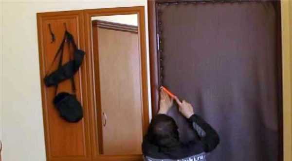 Если описанный выше метод не подходит, можно воспользоваться специальными валиками. Способ уместен в том случае, если дверь нельзя снять для обивки. Валики можно создать самостоятельно из любого теплоизолятора и дерматина.
