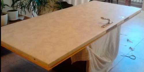 Далее крепим обивку. Ее выкраивают на 15 см больше по длине и ширине. Это запас пойдет на подвороты для формирования аккуратного края.