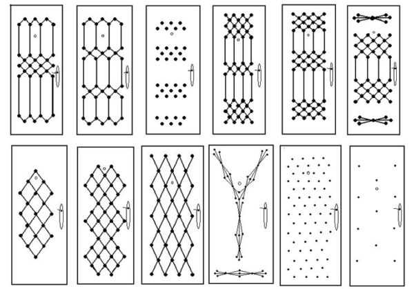 Далее, на поверхности обивки при помощи гвоздей и перетяжек может быть сформирован геометрический рисунок. Несколько вариантов на фото ниже.