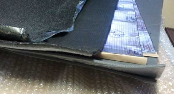 Следующий шаг — крепи звукоизоляцию. Она на клеевой основе, так что проблем нет — вырезали по размерам, аккуратно снимая пленку приклеили. Приклеивая стараемся выдавливать весь воздух, для этого пленку отдираем постепенно, проглаживая материал от края до края.