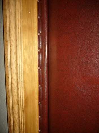 - Валик формируется потом, после того, как уложен винил на полотно. Тут технология другая — полоса крепится по периметру, лицевой стороной вниз. Затем крепится поролон и обивочный материал. Края не подворачиваются, просто обрезаются по размеру. После окончания полоса заворачивается на лицевую сторону (в нее можно уложить полосу поролона), подгибается и крепится обойными гвоздями.