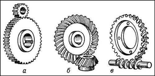 Передачи: а — зубчатая цилиндрическая; б — зубчатая коническая; в — червячная.
