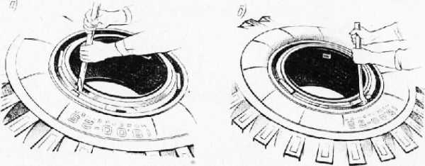 а—снятие замочного кольца; б — снятие посадочного кольца