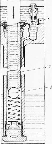 При ходе отбоя масло из полости Д (см. рис. 102) по трубке и каналу в плунжере всасывается в полость Г гильзы насоса; в момент сжатия масло из полости Г поступает обратно в картер маслосборника. Клапан насоса отрегулирован таким образом, что он перекрывает канал в плунжере только в том случае, если понизится уровень масла над поршнем. Когда при ходе сжатия канал в плунжере (рис. 104) перекроется шариком и произойдет дальнейший ход сжатия, масло поступит в зазор между плунжером и гильзой и далее через наклонное отверстие и обратный клапан в надпоршневую полость.
