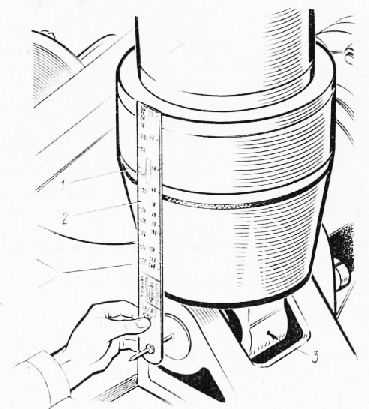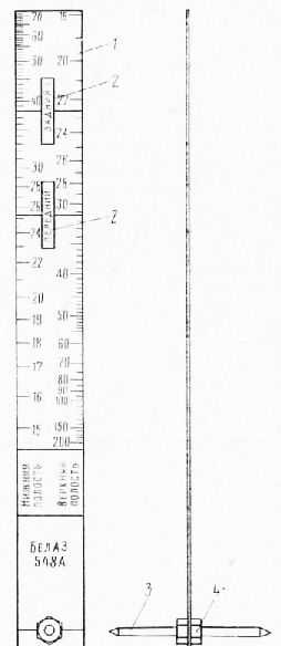 1 — нижняя кромка картера маслосборника, против которой производится отсчет по линейке; 2 — характеристическая линейка; 3 — метка на нижней крышке цилиндра для установки иглы линейки