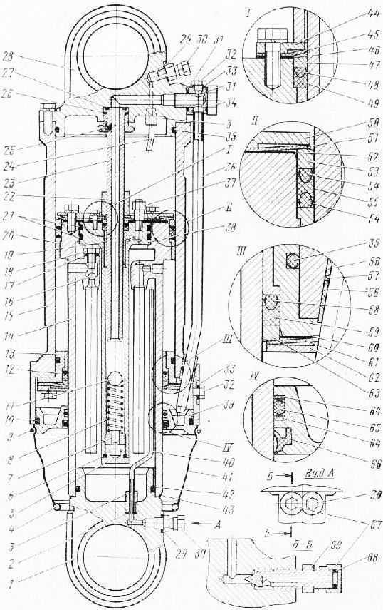 1 — нижняя крышка; 2, 6, 10, 21, 27, 31, 35, 42, 57 и 65 — уплотнительные резиновые кольца; 3 — штуцер; 4 — груз; 5, 18 и 32 — пробки; 7 — регулировочная гайка; 8 — пружина; 9 — шплинт-проволока; 11 — шарик клапана насоса; 12 — корпус манжеты; 13, 19 и 20 — бронзовые буксы; 14 — цилиндр противодавления; 15 — основной цилиндр; 16 — шарик клапана амортизатора; 17, 26, 29, 33 и 68 — уплотнительные медные прокладки; 22 — дистанционная втулка; 23 — плунжер насоса; 24 и 40 — заправочные трубки; 25 — гайка; 28 — верхняя крышка; 30 — зарядный клапан; 34 — зажимный болт; 36 — всасывающая трубка насоса; 37 — обратный клапан; 38 — гильза насоса; 39 — крышка картера маслосборника; 41 — защитный чехол; 43 — стопорная шайба; 44, 50 и 62 — прижимные диски; 45, 51 и 61 — нажимные пружины; 46, 52 и 60 — регулировочные прокладки; 47, 53 и 63 — нажимные кольца; 48, 54 и 58 — распорные резиновые кольца; 49, 55 и 59 — уплотнительные фторопластовые манжеты; 56 — втулка; 64 — защитная фторопластовая шайба; 66 — сальник; 67 — крышка; 69 — заправочный штуцер