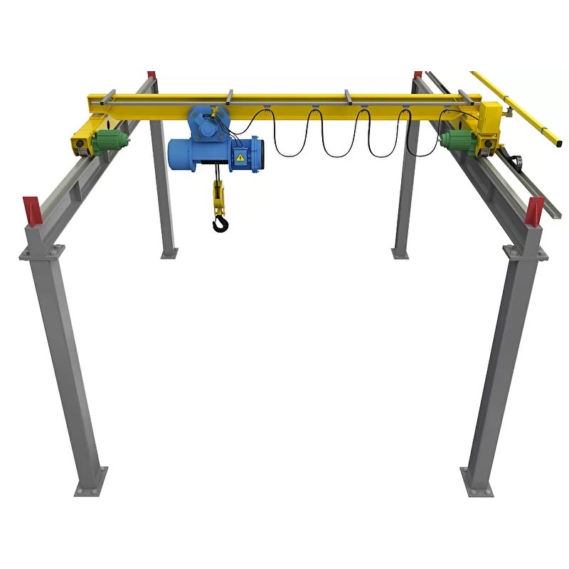 Краны для рабочих станций имеют собственные напольные опоры для поддержки подвесной балки, к которой прикреплен подъемник. Подъемник может перемещаться из стороны в сторону, а верхняя балка также может перемещаться вперед и назад, если она установлена на гусеницах.