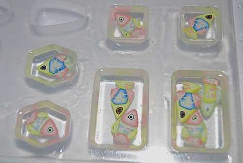 Для заливки в формочки эпоксидка смешивается строго по инструкции, при желании добавляются красители и др. На дно смазанной (или не смазанной, если это силиконовая) формочки наливается слой эпоксидки 3-5мм. Можно сразу кинуть в формочку уже испеченые заготовки из пластики и/или бумаги и другие твердые добавки (рис, бисер, бульонки, глиттер), но если они будут очень тяжелые, они могут осесть слишком близко ко дну и торчать из застывшего изделия выше эпоксидки. Так что лучше дать первому слою эпоксидки застыть — оставьте ее на час-два. И потом, когда первый слой уже начнет застывать, или застынет совсем, смешайте вторую порцию эпоксидки и уже добавляйте декор вместе с ней. Я, например, добавляла нарезанные и запеченые кусочки колбас и маленькие фигурки из пластики. Но можно добавлять почти все, что в голову придет;) Добавляя твердые элементы декора следите за тем, чтобы они были целиком обмазаны еще незастывшей эпоксидкой — чтобы не образовывались пузырьки и воздушные карманы. Работать с уже смешанной эпоксидкой лучше поторапливаясь, максимум 15-30 минут, поскольку некоторые виды смолы застывают очень быстро. Залив второй слой эпоксидки, уже с декором, оставьте ее застывать окончательно. При желании можно добавить и третий, и четвертый слои.