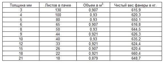 Таблица соотношения размеров, количества и веса древесно-слоистых плит