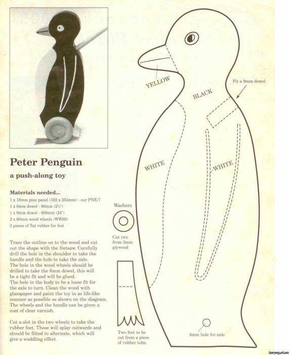 Собирают игрушки из фанеры с помощью столярного клея, шурупов или гвоздей. Как только все части вырезаны и отшлифованы, скрепляем их вместе, чтобы завершить игрушку. Клей хорошо подходит для крепления небольших частей, которые в дальнейшем будут неподвижны, все остальное скрепляем винтами и гвоздями. Здесь важно помнить, что никакие концы металлических креплений не должны выступать над поверхностью дерева. Вот фактически и все! Осталось только украсить нашу игрушку с помощью выжженного узора или ярких красок.