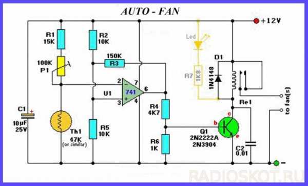 Линейный регулируемый стабилизатор LM317 позволяет регулировать напряжения в диапазоне от 1,2 до 35 вольт. Мне нужен был следующий ряд — 1,5; 5; 9; 12; 15в. Это было выполнено путем подбора сопротивлений резисторов соответствующих положению переключателя на напряжения этого ряда. Правда один вывод переключателя я оставил не задействованным ( фактически разрыв в управляющей цепи микросхемы). Это я оставил сознательно (пусть будет), так как в этом положении на выходе появляется входное напряжение за минусом незначительного падения на микросхеме. У меня это — 33 вольта. Может когда пригодится. Теперь о питании. У меня применен тороидальный трансформатор ТТП-40 с действующим напряжением вторичной обмотки 25в. После входного фильтра (конденсатор С1) напряжение на входе микросхемы 35в. Это почти предел по входному напряжению данного стабилизатора, больше подавать на него не желательно. При работе микросхемы на нагрузках с низким напряжением на ней выделяется значительное тепло. Поэтому она помещена на ребристый радиатор с площадью поверхности около 300 см2. Но его нужно чем-то охлаждать в закрытом корпусе. Решил поставить вентилятор, не очень злобный, 60х60 мм. Но желательно, чтобы он работал, когда на то есть основания, то есть соответствующая температура радиатора, иначе зачем гонять зря воздух с пылью. Появилась схема управления кулером.