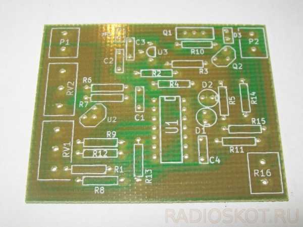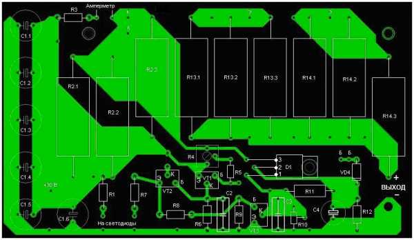 Особое внимание следует уделить выбору трансформатора. Он должен быть достаточной мощности. Я использую всё тот же ТПП-320-220-50, который я использовал и в зарядном устройстве, подобрав выходное напряжение на выходе выпрямителя VD1, равным 30 вольтам, путём выбора определённых обмоток. Не смотря на использование мощных транзисторов, при эксплуатации блока питания необходимо помнить, что нагрузочные способности любых блоков питания ограничены суммарной рассеиваемой мощностью выходных транзисторов. В данном случае, это — 250 ватт (по справочнику). Силовые транзисторы будут сильно греться и могут выйти из строя от падения на их переходах отдаваемого трансформатором напряжения. Так, при выходном напряжении 2,5 В и токе нагрузки 9 А, рассеиваемая на транзисторах мощность будет равна (30 – 2,5) * 9 = 247,5 Ватт. Эта работа «на пределе» приведёт к быстрому выходу транзисторов из строя от перегрева. Поэтому транзисторы необходимо установить на радиаторы достаточного размера. Я использовал в качестве радиаторов алюминиевый корпус своего блока, установив транзисторы через слюдяные прокладки. В качестве выпрямителя VD1, как и в зарядном устройстве, я использовал силовой выпрямительный мост типа КЦ419 (импортный аналог – МВ5010), как результат – не нужна изоляция, компактность и запас по току до 25 ампер (МВ5010 – до 16А). Он также прикручивается непосредственно на корпус. При сборке конструкции обязательно учтите тот факт, что ушко крепления микросхемы соединено с входным выводом микросхемного стабилизатора. Поскольку её выходные токи не превышают 0,2 А, то можете её даже не прикручивать на радиатор, но лучший вариант, если вы прикрутите её через диэлектрическую прокладку на радиатор, на котором стоят выходные транзисторы. Таким образом, Вы сможете использовать тепловую защиту, встроенную в микросхему. Если установить транзисторы и микросхему на отдельный изолированный теплоотвод, то никаких изолирующих прокладок не потребуется. Для контроля тока использован миллиамперметр, резистор R3 подбирают таким, чтобы при подаче напряжения в 1 вольт, было отклонение стрелки прибора на максимум шкалы (на значение = 10). Вольтметр использован заводской, на 25 вольт, без дополнительных добавочных резисторов. Большинство радиоэлементов блока питания размещено на радиоплате размерами 130 х 75 мм, изготовленной из одностороннего фольгированного текстолита. Размещение элементов приводится на рисунке ниже. Микросхема D1 установлена со стороны печатных проводников, под её ушко просверлено большое отверстие в плате (чтобы можно было прикрутить микросхему к металлическому корпусу винтом).