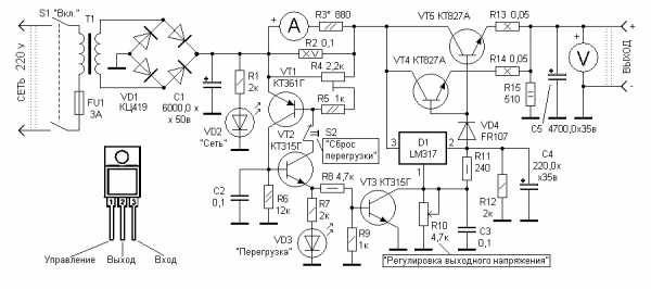 Для уменьшения количества элементов (упрощения схемы), за основу стабилизатора был взят микросхемный стабилизатор напряжения с плавной регулировкой выходного напряжения – LM317 (его отечественный аналог – КР142ЕН12А). Исполнена микросхема в обычном транзисторном корпусе ТО-220. Возможна замена этой микросхемы на LM350, LM338, LТ1083 (аналог – КР142ЕН22А), LТ1084 (аналог – КР142ЕН22), LТ1085 (аналог – КР142ЕН22Б). Все эти микросхемы обладают хорошей нагрузочной способностью (в зависимости от микросхемы – от 3-х, до 7,5 ампер). Они все имеют собственную защиту от перегрузки по току, но так как предъявлено требование к выходному току в 10 ампер, то эта защита в моей схеме не используется. Кроме того, имеется недостаток – минимальное напряжение, которое микросхема выдаёт – 1,25 вольта, а нам надо – 0 вольт. Для возможности получения выходного напряжения от нуля, радиолюбителями предлагаются схемы с дополнительными источниками отрицательного напряжения смещения, но мы пойдём по другому пути.