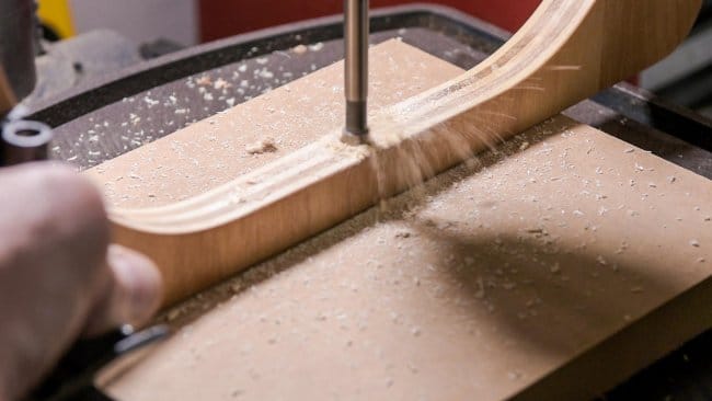Во-первых, вам уже понадобится деревянная форма для гибки, которая не показана. Для начала вам нужно разрезать полоски фанеры с помощью ленточной пилы. После того, как вы это сделаете, вам нужно будет прижать фанеру к деревянной гибочной форме для пробного прогона, чтобы сделать ее гибкой.