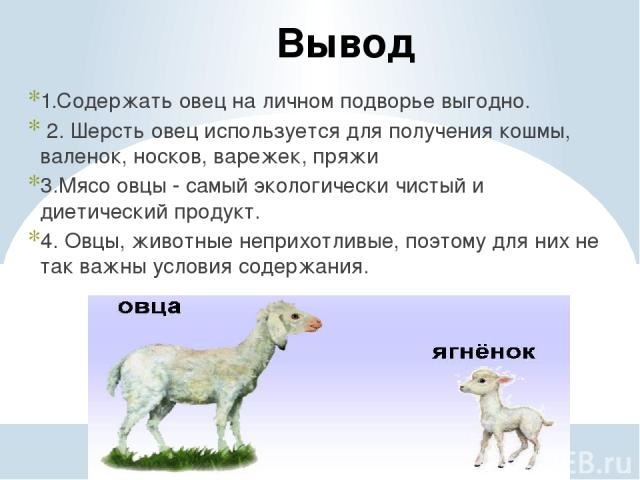 При этом, среди множества произрастающих в самом различном климате растений (около 800 видов) для баранов и овец съедобными являются около 400, в то время как коровам и козам подходят лишь порядка 150 видов, а лошадям – менее 100. Сегодня выращивать баранов и овец выгодно и с точки зрения количества конечного продукта. Среди домашних животных нет ни одного вида, который, как овцы, служили бы источником и мяса, и молока (включая изготовленные из него продукты), и высококачественных шерсти и меха. При этом овечье молоко усваивается значительно лучше коровьего и превосходит его по содержанию сухих веществ, белков и жиров, а мясо наименее насыщено холестерином.