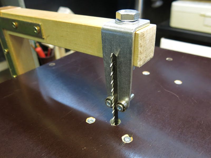Один из наиболее важных узлов устройства, служащий подвижным штоком и фиксатором пильного полотна, требует повышенной надежности. Данный элемент изготавливается из длинной металлической полоски, толщиной в 1 мм. На конце обводиться контур хвостовика пилки, после чего делается надпил треугольным напильником для создания прижимной пластинки. Часть металлической полоски загибается пассатижами по контуру хвостовика, после чего в импровизированное крепление устанавливается пилка и просверливается сквозное отверстие для дополнительной фиксации с помощью болта.