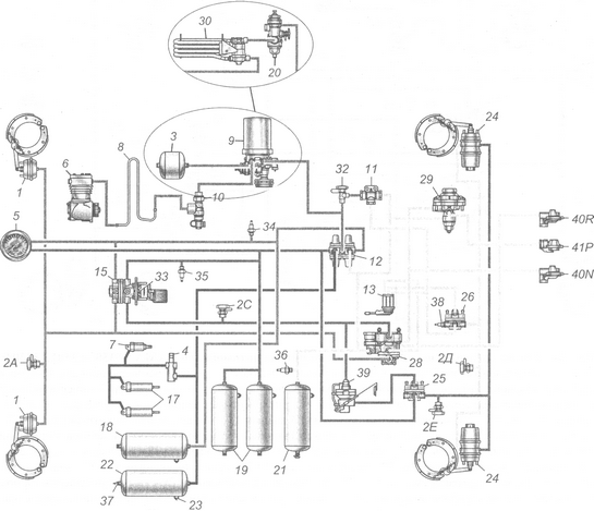 Кран управления стояночным и запасным тормозом. | Обратного действия, клапанного типа, со следящим устройством |
