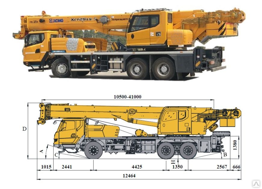- Размер габаритов автомобильного крана в метрах ДШВ – 12.36х2.50х3.38;