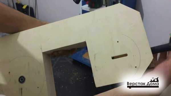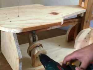 Следующий этап – изготовление рабочего стола с поворотным механизмом. Поворотная дуга с прорезью выпиливается из фанеры.