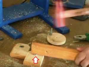 Рычажная конструкция собирается из деревянных заготовок. Разумеется, обычные сосновые бруски тут не подойдут. Надо использовать дуб или бук. Пусть вас не пугает стоимость такого материала – для рычагов прекрасно используются ножки от старого стула. Вырезаем наиболее прямые участки – и прочный рычажный механизм готов.