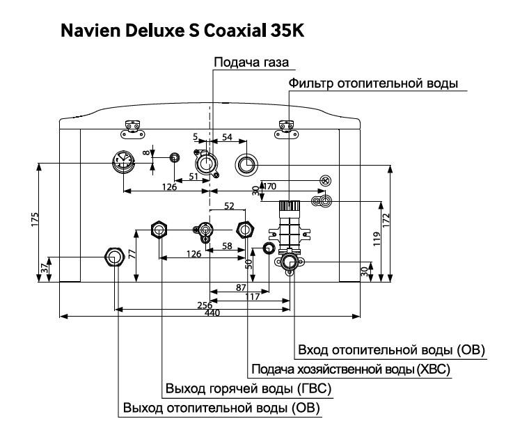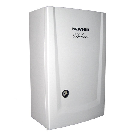 - Navien Deluxe Plus -24k COAXIAL, мощность 24 кВт, отопление — 240 м2, максимальная/минимальная производительность — 24/9 кВт, расширительный бак — есть, электронасос — есть, отопление + горячее водоснабжение, КПД-90,5%, тепло теплообменник — стальной, расход газа — 2,58 м3/час, цена — 28 500 руб.
