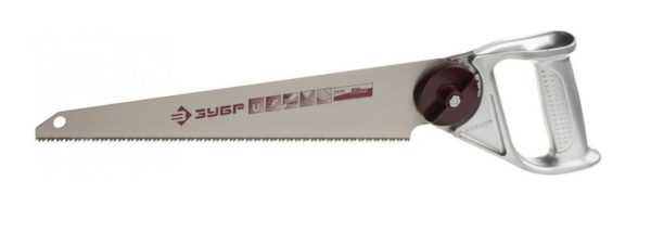 Ножовка по дереву Зубр Эксперт, отличается довольно удобной ручкой из пластика. Зубцы из каленой стали в форме треугольника, имеют две режущие кромки. Этой пилой можно совершать продольный и поперечный распил. Длина полотна, как и число зубьев на дюйм подбирается индивидуально. Есть несколько вариантов этой модели. Отлично справляется с распилом любых сортов дерева. Для садовых работ стоит выбрать вариант с меньшим значением TPI. Цена инструмента примерно 12 — 15 долларов.