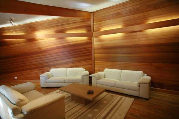В интерьере кабинета, гостиной, прихожей отлично смотрятся жестко очерченные панели из вагонки. В том же ключе можно оформить стену в столовой зоне на кухне. Только качество ее и окраска должны быть идеальными.