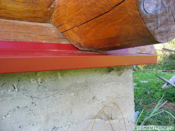 Отливы для цоколя фундамента деревянного дома выполняют в аналогичной последовательности. В этом случае отгиб можно не выполнять – достаточно пропилить в бревне паз для планки отлива.