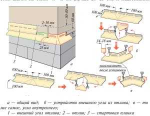 - Установку отливов вначале выполняют с угловых частей здания, а затем на ровном участке. На участках ровного вида, при соединении, материал укладывается внахлест около 3 сантиметров.
