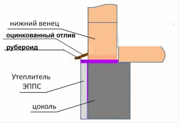 Для того чтобы защитить цоколь в доме деревянного вида, на фундамент устанавливают отливы. При использовании сруба, нужно создать герметичное соединение всех узлов, и углов наружного вида.