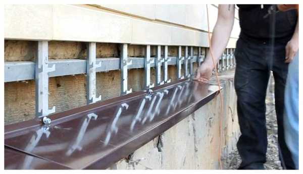 Отливы на цоколь крепят к стене или направляющим профилям облицовки, в таком случае требуется предварительно смонтировать каркас навесного фасада.