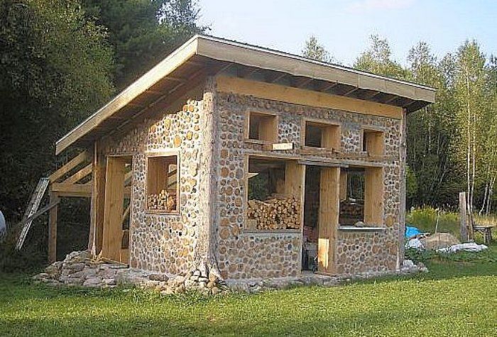 Что бы построить такой дом необходимо взять старые автомобильные шины, наполнить их землей и сложить наподобие кирпичей. Благодаря большому диаметру шин, такой дом не нуждается в основательном фундаменте. После постройки дома, стены из шин можно оштукатурить. Внутренние стены облицовываются алюминиевыми банками или стеклянными бутылками.