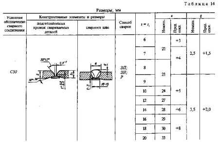 14. Предельные отклонения катета углового шва К, К_1 от номинального в случаях, не оговоренных в таблицах, должны соответствовать: