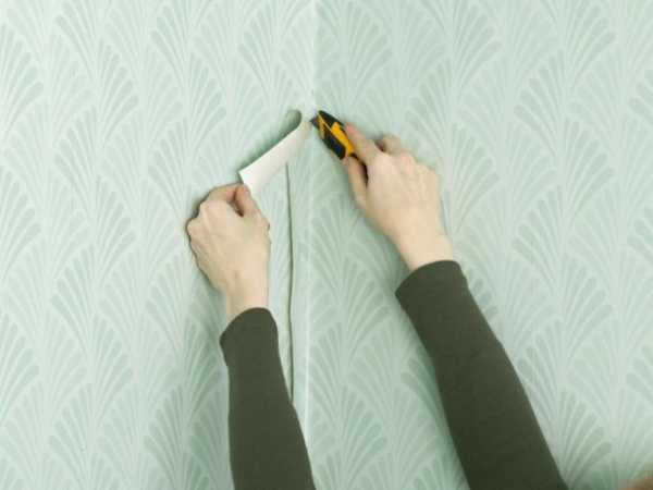 Этот метод позволяет поклеить обои так, что стык не будет расходиться и иметь зазоров. Полотна укладываются внахлест, края остаются непроклеенными. После подгонки рисунка чертится прямая линия, на границе которой устанавливается ровная деревянная или железная линейка. Острым строительным ножом полосы разрезаются.