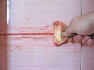 - После нанесения клея следует немного подождать, пока материал станет увлажненным и сразу клеить полотно на стену еще до начала его разбухания.
