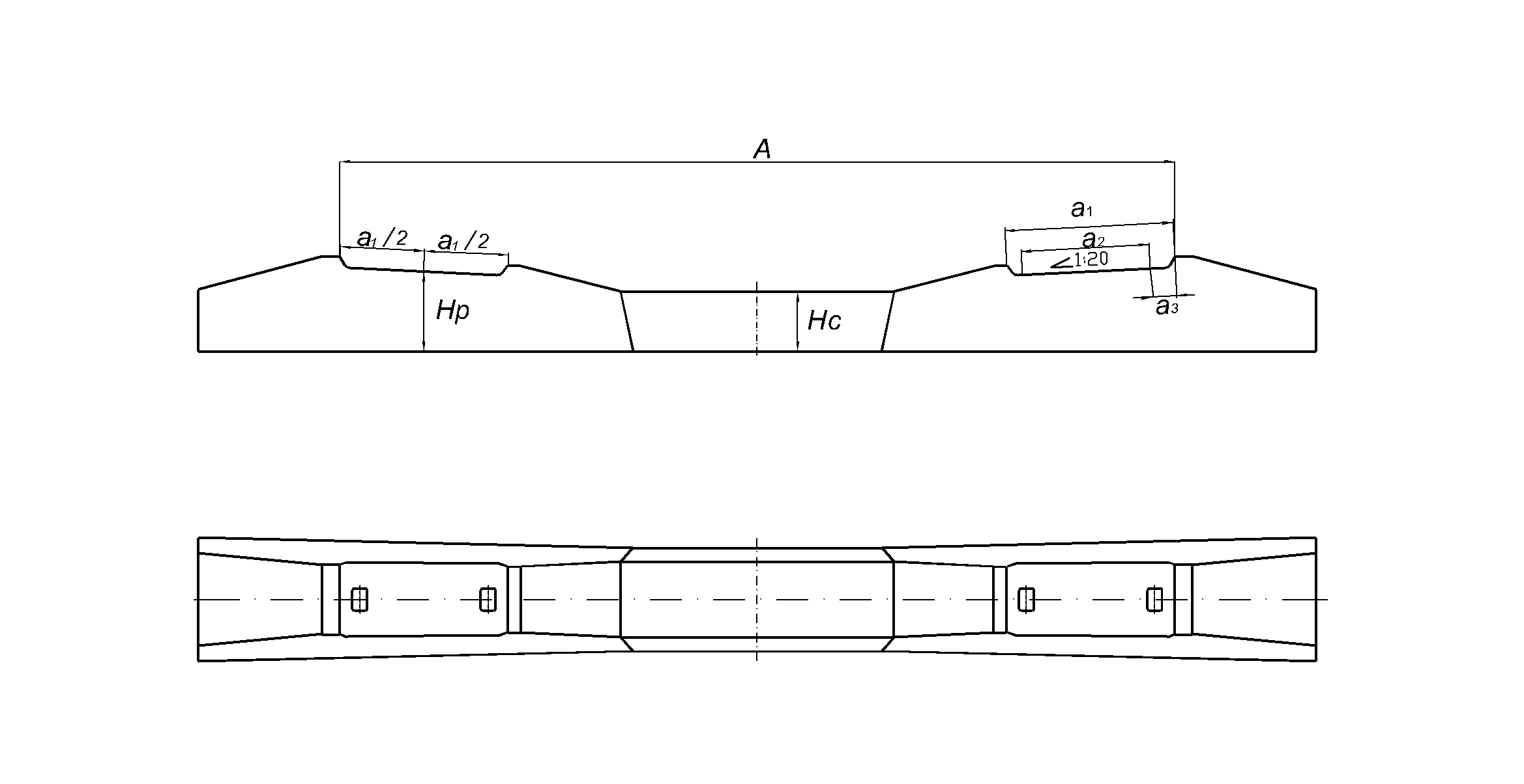Форма и основные размеры шпал представлены на рисунке 1 и в рабочих чертежах ВНИИЖТ РЧ 2008-01.00.000.