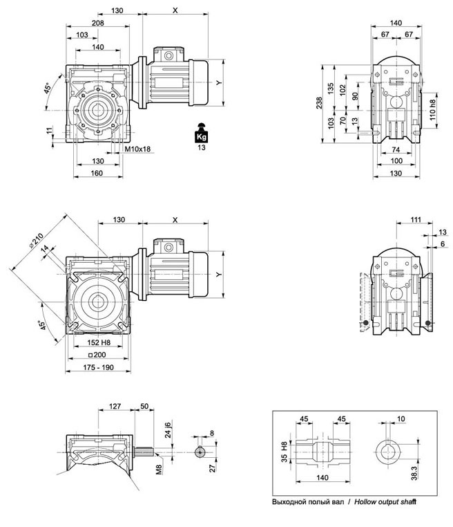 Использование полых выходных валов становится все более распространенным на внутреннем рынке США, поскольку они предлагают несколько преимуществ по сравнению со сплошным выходным валом. OEM-производитель оборудования может удлинить приводной вал на относительно короткое расстояние и установить червячный редуктор с полым отверстием на удлиненный вал. Этот метод монтажа устраняет необходимость в цепях, ремнях или другом оборудовании для передачи крутящего момента от редуктора со сплошным валом к устройству. Защита упрощается, а техническое обслуживание, обычно требуемое для цепей и ремней, исключается. Некоторые производители предлагают герметичный редуктор на весь срок службы, который не требует вентиляционной пробки или изменения уровня масла для различных монтажных положений. Эти функции позволяют выполнять монтаж в нескольких положениях без необходимости перемещать сапун или добавлять смазочное масло. Из-за популярности червячных редукторов и множества различных применений они доступны в стандартных комплектах и комплектах для промывки в пищевой промышленности, имеют входы C-образной поверхности для стандартных двигателей NEMA и имеют несколько вариантов, таких как монтажные фланцы и основания.