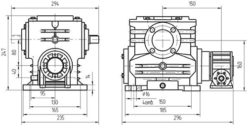 Червячная передача в червячном редукторе проходит под углом 90 градусов к входному червячному валу. Поскольку червячная передача установлена на выходном валу, а вал расположен под углом 90 градусов к входному, оба конца выходного вала доступны для использования в приложении. Доступные распространенные конфигурации выходного вала включают одинарные и двойные удлиненные сплошные валы, а также полые выходные валы.