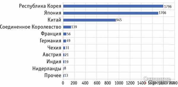 На протяжении 2018 г. российские предприятия закупали экскаваторы производства 15 стран мира. 93% ввозимой в Россию техники были разделены тремя странами-изготовителями. Этими странами, как и в 2017 г., стали Республика Корея, Япония и Китай. Их расположение в рейтинге также осталось прежним. Первое занимает Республика Корея, в 2018 г. в Россию отправились 1796 корейских экскаваторов, что составляет 37,55% от всей закупленной техники.