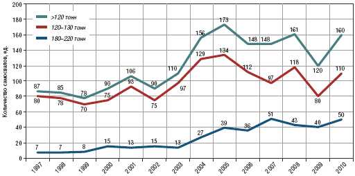 Рис. 14 Сегментация рынка импортных самосвалов в классе грузоподъемности 50–220 тонн в период 1997–2010 гг.