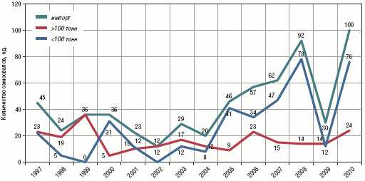 Рис. 3 Динамика импорта гидравлических экскаваторов основных типоразмеров в РФ в период 1999–2011 гг.