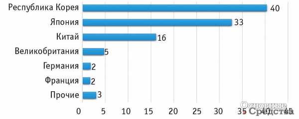Основу импорта составляет продукция производства трех стран. Лидирующую позицию занимает Республика Корея, на долю которой по итогам 9 месяцев 2017 года пришлось 40% всего объема ввезенных экскаваторов. Годом ранее доля южнокорейских производителей составляла 30%, что позволяло им находиться лишь на второй строчке рейтинга. Первое же место год назад принадлежало Японии, опустившейся в текущем году на вторую позицию. Доля ее за год снизилась с 50 до 33%. Тройку лидеров замыкает Китай с долей 16% против 12% в 2016 году. Далее следуют Великобритания, Германия, Франция, Индия, Австрия и еще пять стран.