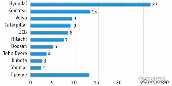 Лидирующие бренды в этой весовой категории – Komatsu, Hyundai и JCB (больше половины поставок). Доля 6-8-тонников – 8%, из них две трети за маркой Hitachi. Экскаваторам массой менее 1 т принадлежит совсем малая доля рынка – 3% (большинство – марки Kubota). Мини-экскаваторы массой 8-10 т востребованы единично: в 2014 году их было импортировано всего две штуки.