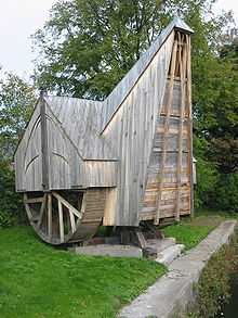 Реконструкция средневекового крана в БельгииПростейшие подъёмные краны, как и большинство грузоподъёмных машин, до конца XVIII века изготовлялись из дерева и имели ручной привод[8].