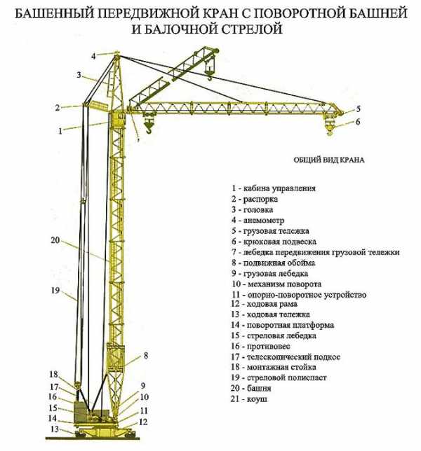 Существует множество типов башенных кранов. Они нашли широкое применение при строительстве зданий и сооружений в производстве погрузочно-разгрузочных работ. Башенный кран состоит из следующих основных узлов: башня, ходовая рама с колесами, опорно-поворотное устройство, поворотная платформа с грузовой и стреловой лебедкой, с противовесом; механизм поворота и электрооборудования, механизм подъема груза, механизм для изменения вылета, механизм передвижения крана и т.д